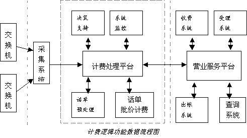 從邏輯功能上分,它經(jīng)常被分為三部分:采集系統(tǒng)、計費處理系統(tǒng)、營業(yè)服務(wù)系統(tǒng)。其具體數(shù)據(jù)流程如下圖所示: