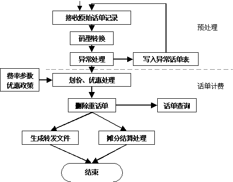 區(qū)域計費中心從交換機(jī)實時/定時采集原始話單數(shù)據(jù),它是整個系統(tǒng)的起始點,也是系統(tǒng)其它部分的基礎(chǔ)。其性能直接影響整個系統(tǒng)的運行效果。對該模塊要求穩(wěn)定可靠、處理靈活。 “八國九制”意味著,一個好的計費采集系統(tǒng),必然要求它能夠處理多種交換機(jī)格式。比如EWSD、S1240、5ESS等等。 在采集所用網(wǎng)絡(luò)傳輸協(xié)議上,一般要求系統(tǒng)支持X.25/FTAM、X.25/CMIP等協(xié)議。 2.計費結(jié)算 采集機(jī)從交換機(jī)上采集下來原始話單文件,該類文件是BCD碼文件,需要進(jìn)行碼型轉(zhuǎn)換,變成ASCII碼文件,為后續(xù)的計費處理創(chuàng)造條件。 話單格式轉(zhuǎn)換:話單格式轉(zhuǎn)換從交換機(jī)下載的二進(jìn)制信息中提取用于計費和統(tǒng)計的信息,并從二進(jìn)制格式轉(zhuǎn)換為文本格式。但是由于上面提到的原因,國內(nèi)交換機(jī)種類比較多,各種交換機(jī)的數(shù)據(jù)格式都不相同,即使是相同的交換機(jī),由于需要版本升級,也會對數(shù)據(jù)格式產(chǎn)生影響。假如預(yù)處理模塊不能靈活地處理各種格式的文件,則勢必會對電信服務(wù)商的投資造成浪費。國創(chuàng)公司在話單預(yù)處理中,提供了一種“自定義話單格式”方式,用戶可以根據(jù)自己交換機(jī)的數(shù)據(jù)格式進(jìn)行配置,而預(yù)處理模塊不需進(jìn)行修改。即可以適應(yīng)當(dāng)前多種交換機(jī)并存的局面,又可以適應(yīng)未來交換機(jī)版本升級的需求,極大地保護(hù)了用戶的投資。 計費劃價處理: 計費計算模塊根據(jù)話單中記錄的起始時間、通話時長、對端號碼等信息在資費策略庫中查找滿足條件的費率極其優(yōu)惠策略。從而計算出此次通話應(yīng)向用戶收取的基本費用。特別地,考慮到業(yè)務(wù)的發(fā)展與變化,系統(tǒng)可對費用中的各項子費用單獨計算,并能夠適應(yīng)新的優(yōu)惠策略的增加。整個計費流程如下: