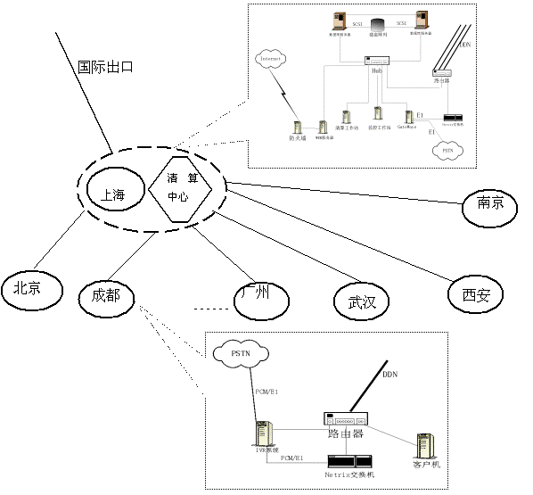 數(shù)據(jù)網(wǎng)絡(luò)為DDN專線構(gòu)成的Intranet,該Intranet在國(guó)內(nèi)可以有一個(gè)以上的國(guó)際出口。并通過防火墻同Internet連接。語音/數(shù)據(jù)的傳輸采用網(wǎng)絡(luò)交換設(shè)備。