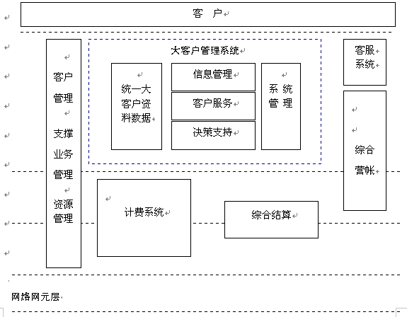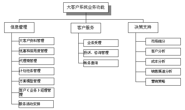 電信大客戶管理系統(tǒng)是在收集大客戶市場調(diào)查信息、大客戶資料信息、大客戶經(jīng)營戰(zhàn)略資源的基礎(chǔ)上,自動(dòng)采集專業(yè)計(jì)費(fèi)、綜合營帳、客服、網(wǎng)管、財(cái)務(wù)等系統(tǒng)的相關(guān)數(shù)據(jù),實(shí)現(xiàn)快速、全面、準(zhǔn)確的新客戶業(yè)務(wù)受理、新增需求受理及故障處理過程通道,實(shí)現(xiàn)完善的客戶經(jīng)理管理、代理商管理系統(tǒng),最終實(shí)現(xiàn)完整的大客戶滿意度評(píng)估體系和針對大客戶的個(gè)性化服務(wù)。建成后的系統(tǒng)從管理、服務(wù)、分析三方面出發(fā)主要應(yīng)具備信息管理、客戶服務(wù)、決策支持功能。