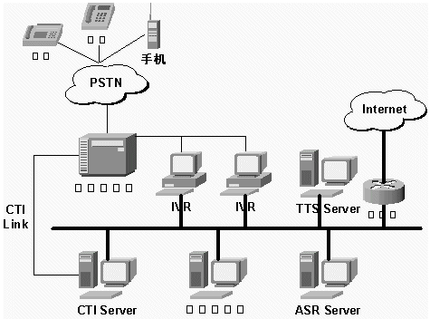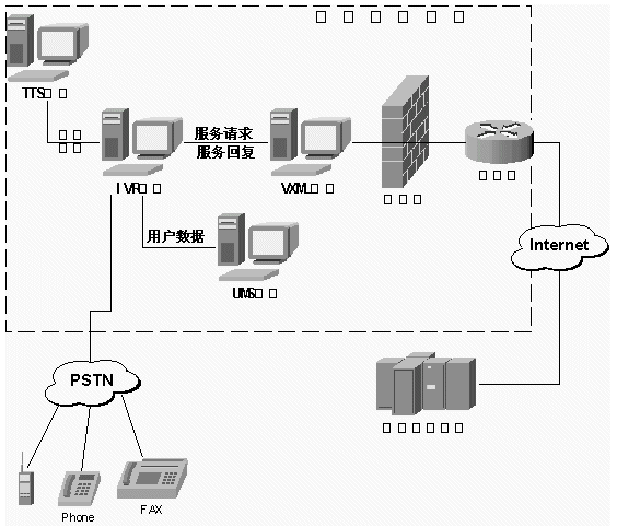 TTS系統(tǒng)、VXML系統(tǒng)、UMS系統(tǒng)與已有IVR(電話語音自動(dòng)應(yīng)答系統(tǒng))平臺、Internet、PSTN結(jié)合的示示意圖如下: