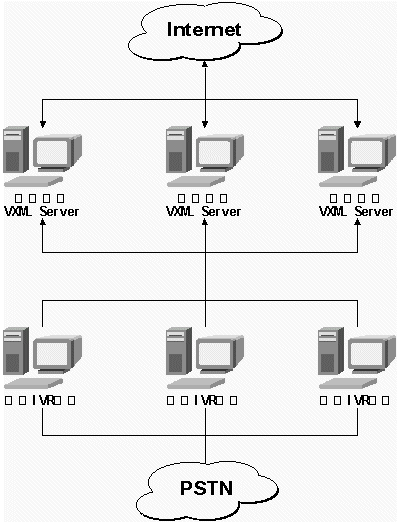 在數(shù)據(jù)中心設(shè)置VXML服務(wù)器,提供訪問互聯(lián)網(wǎng)絡(luò)的接口,地市臺與中心服務(wù)器使用標(biāo)準(zhǔn)的基于應(yīng)用層的協(xié)議通訊。地市臺與數(shù)據(jù)中心交換網(wǎng)頁和其他數(shù)據(jù),這種交換是實(shí)時(shí)的。各地市的電話用戶就能利用運(yùn)營商提供本地電話號碼訪問互聯(lián)網(wǎng)上的信息。