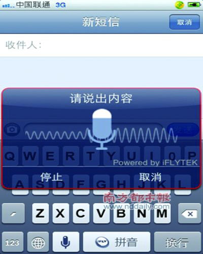 錄入結(jié)束后,點(diǎn)擊“停止”,輸入法會(huì)自動(dòng)開始對(duì)剛才錄入的語音進(jìn)行識(shí)別。需要注意的是,這個(gè)時(shí)候只有通暢的3G網(wǎng)絡(luò)或者W IFI網(wǎng)絡(luò),才能順利識(shí)別;如果信號(hào)欄顯示“E”或者“O”,都將無法得到正確識(shí)別,也無法錄入短信內(nèi)容。