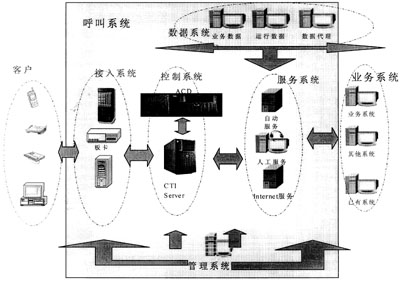 根據(jù)平臺與業(yè)務(wù)系統(tǒng)相分離的設(shè)計(jì)原則,AnyTouch系統(tǒng)由呼叫系統(tǒng)和業(yè)務(wù)系統(tǒng)兩部分組成。在呼叫系統(tǒng)中,CTI Server和ACD Server是整個系統(tǒng)的核心,因?yàn)槿魏我粋呼叫的生命周期都存在于CTI Server中,而ACD Server提供控制每個呼叫下一步活動的智能排隊(duì)算法服務(wù)。