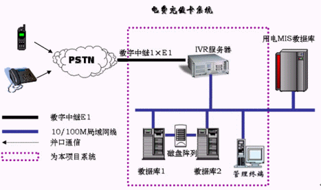 電力繳費(fèi)卡系統(tǒng)系統(tǒng)由自動(dòng)語音流程服務(wù)器IVR、系統(tǒng)管理終端和數(shù)據(jù)庫三部分組成。如下圖所示: