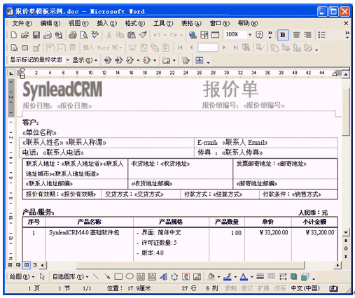 SynleadCRM企業(yè)版4.0很好地滿足了銷售自動(dòng)化管理、服務(wù)自動(dòng)化管理的上述需求,提供了開放的客戶化Word模板,使得用戶企業(yè)能夠根據(jù)實(shí)際情況不斷擴(kuò)展該應(yīng)用。客戶化模板直接在Word中編輯,可直觀、方便地插入合并域字段或代碼,只要對(duì)Word稍加了解就可勝任模板維護(hù)工作。