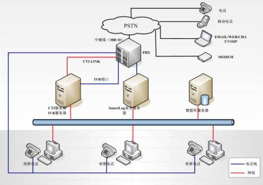 呼叫中心前端通信平臺,主要由SIEMENS HiPath3800交換機,計算機電話集成服務器(UltraCTI),交互式語音應答服務器(ctsIVR),在線錄音監(jiān)聽服務器(SmartLog),數據庫服務器,MCI服務器以及傳真服務器幾個部分組成。中繼線采用30B+D接入。
