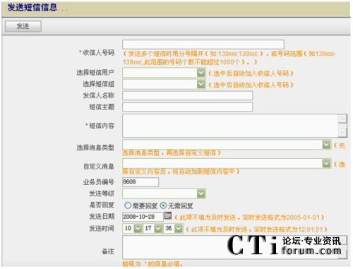- 群發(fā)短信:通過個人的Web方式的客戶端給系統(tǒng)預先設置好的用戶組或?qū)懭攵鄠對方手機號碼發(fā)送短信;