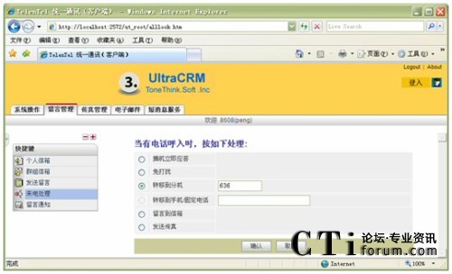 信箱主人通過Web方式的客戶端,根據(jù)實際需要,將來話設置為轉(zhuǎn)接到不同的目標,如:語音信箱留言、內(nèi)部其它分機、轉(zhuǎn)移至手機、轉(zhuǎn)移至外線;