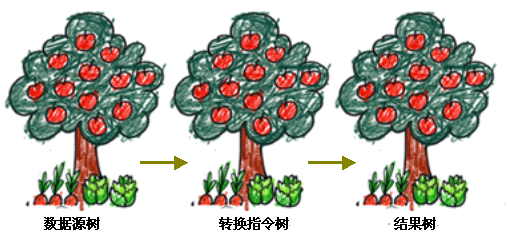 一棵或多棵數(shù)據(jù)源樹(XML數(shù)據(jù)源文件),通過一棵轉(zhuǎn)換指令樹(選擇數(shù)據(jù)、表達(dá)數(shù)據(jù)表現(xiàn)形式的模板文件),獲得了一棵結(jié)果樹(圖表、報(bào)表)。