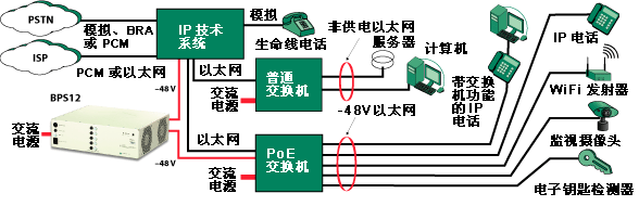 上圖顯示了如何將 BPS12 部署到典型的網(wǎng)絡中。該公司擁有一個 IP 電話系統(tǒng),并使用 BPS12 來確保當交流電源中斷時電話服務繼續(xù)工作。此方案中沒有使用