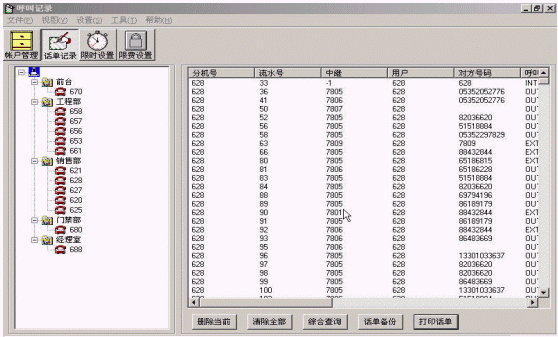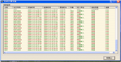 實時計費系統(tǒng)不但對與外線接通的呼叫進行記錄,同時對內(nèi)線之間的呼叫、未接通的呼叫進行記錄,并且在發(fā)生轉(zhuǎn)接的情況下,分別對不同分機做呼叫記錄。
