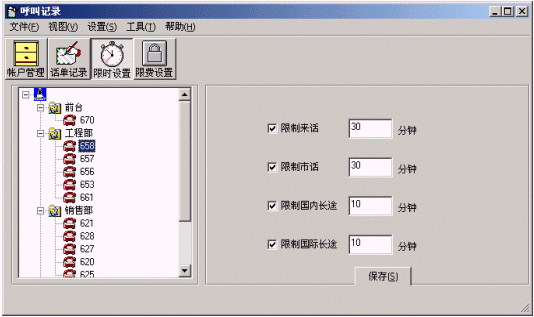 ·分機限時功能:針對特定分機根據(jù)不同的呼叫類型(國際長途、國內(nèi)長途、市話、來話等)設(shè)置不同的通話時長限制;