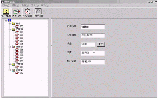 ·團體限費功能:多個分機組成一個團體,針對團體內(nèi)的每一個分機根據(jù)呼叫類型限制通話費用,可以實現(xiàn)團體的押金管理;