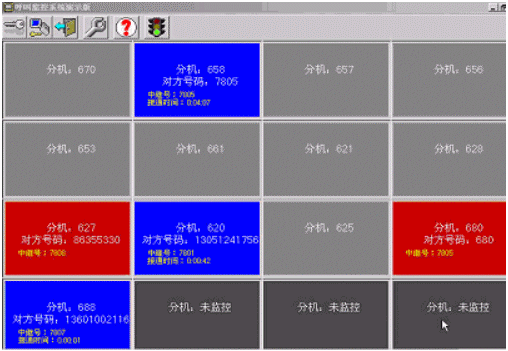 呼叫實時監(jiān)控功能實現(xiàn)了實時顯示每一個分機摘機、呼叫、通話掛機的狀態(tài),以便管理者實時、動態(tài)了解當前內(nèi)部通信網(wǎng)絡(luò)的狀況和每一個分機或員工的工作狀態(tài)。