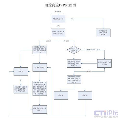 麗途商旅呼叫中心整個(gè)呼叫流程是:客戶通過(guò)全國(guó)400電話呼入系統(tǒng),IVR自動(dòng)應(yīng)答,根據(jù)客戶來(lái)電號(hào)碼通過(guò)URL的方式和業(yè)務(wù)系統(tǒng)數(shù)據(jù)庫(kù)進(jìn)行查詢?cè)搧?lái)電號(hào)碼是否是老客戶,然后直接播報(bào)客戶對(duì)應(yīng)的企業(yè)名稱(chēng)和麗途的歡迎語(yǔ),客戶可以進(jìn)行訂單的審批和密碼驗(yàn)證或者轉(zhuǎn)人工服務(wù);如果是來(lái)電號(hào)碼在數(shù)據(jù)庫(kù)中不存在,IVR系統(tǒng)提示客戶輸入企業(yè)編號(hào)或者轉(zhuǎn)接人工服務(wù),輸入企業(yè)編號(hào)還會(huì)在數(shù)據(jù)庫(kù)中查詢是否是已存在客戶并執(zhí)行相應(yīng)的流程,如是新客戶那么就會(huì)轉(zhuǎn)接人工服務(wù),由人工來(lái)進(jìn)行訂單的制定、審批,密碼驗(yàn)證等工作。