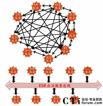 簡單一點,下面兩種構架的方式,第一種,雜亂無章,第二種,非常清晰,第二種用的就是ESB的方式。