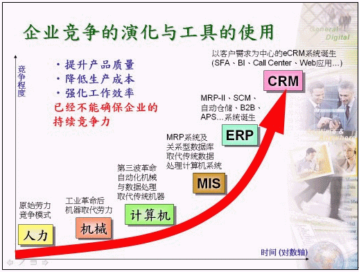 過去企業(yè)為取得同業(yè)間之競爭優(yōu)勢,無不絞盡腦汁針對『產(chǎn)品質(zhì)量』、『生產(chǎn)成本』及『工作效率』等作為主要改善目標(biāo),除了從本身管理制度的檢討改進(jìn)外,同時(shí)也積極運(yùn)用現(xiàn)代信息科技的力量,規(guī)劃出適合自己的企業(yè)e化版圖,以因應(yīng)全球化競爭時(shí)代的來臨,在此同時(shí)許多信息系統(tǒng)也逐步推動(dòng)導(dǎo)入企業(yè)內(nèi)部,包括:早期的MIS系統(tǒng)、近期的ERP系統(tǒng)、甚或電子簽核系統(tǒng)等,主要目的為提升內(nèi)部工作效率、節(jié)省內(nèi)部生產(chǎn)成本等作準(zhǔn)備,以『節(jié)流』為目標(biāo)強(qiáng)化企業(yè)自身的競爭能力。