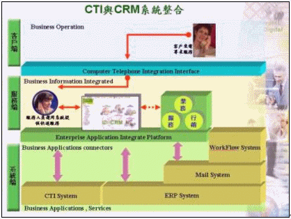 但傳統(tǒng)的CTI系統(tǒng)其重點(diǎn)乃是著重在服務(wù)工作的自動(dòng)化方面,只提供簡單的客戶來電訊息提示,對于客戶進(jìn)一步的背景資料、嗜好、購買需求及歷史往來記錄并不清楚也無法實(shí)時(shí)得知,更別說想藉由CTI系統(tǒng)來提供客戶個(gè)人化的服務(wù)、有效節(jié)省通話時(shí)間、刺激其潛在的購買需求,為了達(dá)成上述的目標(biāo),唯有將CTI系統(tǒng)與CRM系統(tǒng)進(jìn)行整合,如此,客戶服務(wù)的質(zhì)量才可能達(dá)成某個(gè)程度的提升,而良好的客戶關(guān)系管理也將是未來呼叫中心運(yùn)作成功與否的關(guān)鍵所在。