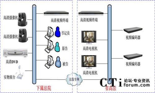 系統(tǒng)覆蓋省高院法庭、8個地市中院法庭和58個基層法庭。系統(tǒng)利用法院專用IP傳輸網絡,以省高院各法庭為一級中心,地市中院為分控中心,基層法院為末端接入。在省高院中心、地市中院和基層分院設立遠程數字庭審中心,配置庭審視頻終端、專用攝像機和麥克風,實現圖像傳輸和遠程通信。