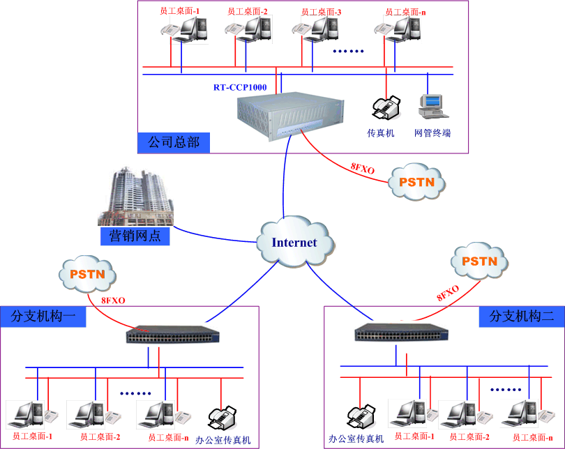 項(xiàng)目建設(shè)中,既要充分考慮到后續(xù)隨時(shí)隨地分支機(jī)構(gòu)的加入,又要考慮中繼線路的擴(kuò)容等因素。融天科技RT-CCP1000融和通信一體化平臺,既能靈活的實(shí)現(xiàn)企業(yè)異地組網(wǎng)方式,又能方便的位企業(yè)定制各種個(gè)性化的增值業(yè)務(wù),如自動(dòng)值機(jī)、語音郵箱、電話會議、個(gè)人傳真等個(gè)性化業(yè)務(wù),不用增加任何硬件設(shè)備的情況下還能輕松的實(shí)現(xiàn)呼叫中心功能、與用戶方已有的ERP、CRM系統(tǒng)對接功能等,方案組網(wǎng)如下: