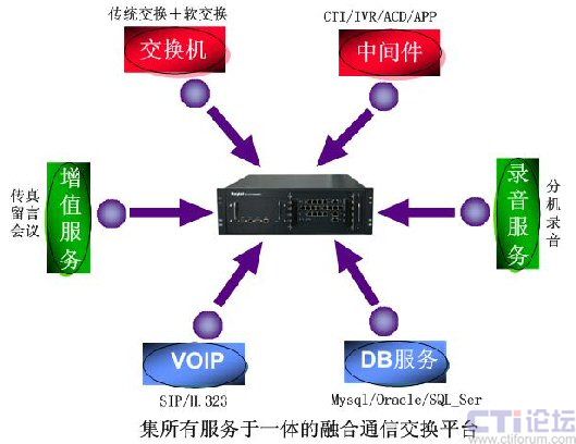 融天科技多媒體呼叫中心采用國(guó)際領(lǐng)先技術(shù)的融合通信一體化平臺(tái),該平臺(tái)集傳統(tǒng)PBX、IP-PBX于一體,集CTI、IVR、ACD、APP等服務(wù)功能于一體,集錄音、傳真、會(huì)議、留言等全套的增值業(yè)務(wù)于一體,硬件平臺(tái)非常簡(jiǎn)單,用戶(hù)只需要購(gòu)買(mǎi)一臺(tái)硬件設(shè)備即可: