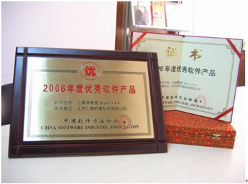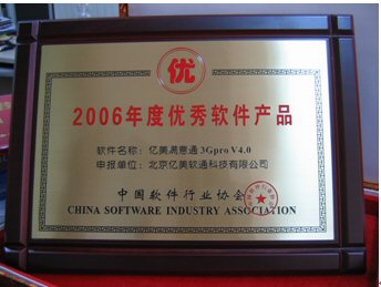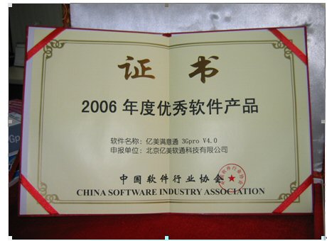2006年1月18日,由中國軟件行業(yè)協(xié)會頒發(fā)的“2006年度推薦優(yōu)秀軟件產(chǎn)品”獎,經(jīng)過層層評審,終于浮出水面。北京億美軟通科技有限公司推薦的面向3G應(yīng)用的移動商務(wù)產(chǎn)品——億美滿意通3Gpro憑借著不俗的表現(xiàn)喜獲殊榮。