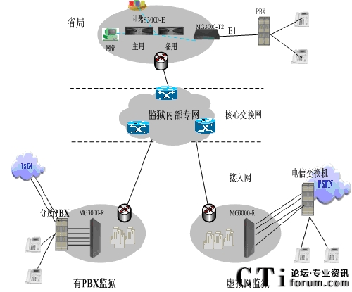 在有PBX監(jiān)獄部署智能路由網(wǎng)關MG3000-R32(或者數(shù)字中繼網(wǎng)關MG3000-T4),網(wǎng)關通過10/100Base-T以太網(wǎng)接口連接IP網(wǎng)絡,注冊到軟交換平臺通過路由匯接,成功的把全省各監(jiān)獄的內(nèi)部電話互連互通起來。