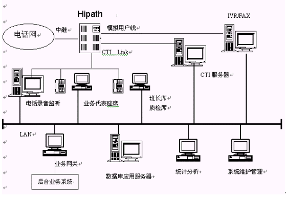 主要包括:Siemens Hipath 3000系列交換機、CTI服務(wù)器、IVR/FAX服務(wù)器、業(yè)務(wù)代表座席、班長和質(zhì)檢座席、電話錄音監(jiān)聽系統(tǒng)、數(shù)據(jù)庫應(yīng)用服務(wù)器、業(yè)務(wù)網(wǎng)關(guān)、統(tǒng)計分析工作站、系統(tǒng)維護管理工作站、網(wǎng)絡(luò)系統(tǒng),其邏輯結(jié)構(gòu)下圖所示。