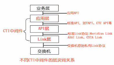 根據CTI的功能定位,可以把CTI產品劃分為不同的層次,一般地可分為三種類型:Link層產品、API層產品、應用層產品,其分層結構示意圖如下所示: