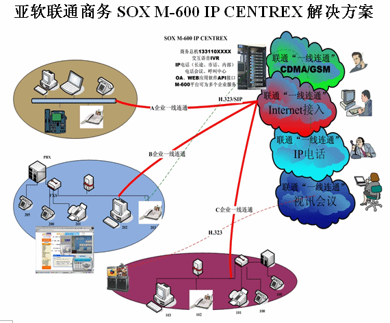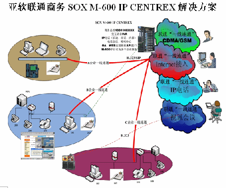 亞軟SOX融合通信解決方案也叫聯(lián)通商務(wù)解決方案,該方案是基于軟交換的可為多個集團用戶提供IP語音解決方案。SOX融合通信解決方案為集群用戶提供了區(qū)別于傳統(tǒng)集團內(nèi)部、外部的通信方式,集團無需再購置PBX及為其支付維護費用。由于SOX融合通信解決方案是置于IDC托管中心并基于IP軟交換技術(shù),所以沒有地域限制,具有集群性、可移動性等IP通信特征。