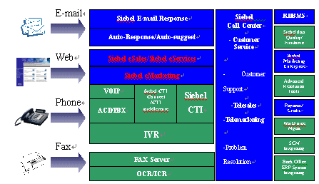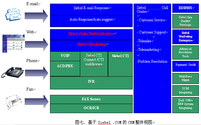 電子商務(wù)網(wǎng)站的運作和企業(yè)網(wǎng)站的建設(shè),為其帶來了更多的市場商機,嶄新的客戶接觸的機會?蛻粼谝幻腌妰(nèi)就能決定是選擇你還是別人,可以說未來網(wǎng)戰(zhàn)、傳統(tǒng)企業(yè)的競爭就是客戶關(guān)系的競爭;網(wǎng)站要生存,企業(yè)要發(fā)展,關(guān)鍵要在發(fā)展客戶關(guān)系上下功夫。如何涉足CRM領(lǐng)域,如何盡快地利用CRM先進(jìn)的客戶關(guān)系管理理念,是擺在網(wǎng)站和傳統(tǒng)企業(yè)面前的一個棘手問題。以基于Siebel .COM應(yīng)用為涉足CRM的切入點,使企業(yè)能夠更好地實施電子商務(wù)計劃,積極發(fā)展基于Web的客戶關(guān)系管理,最終使網(wǎng)站和企業(yè)真正成為接觸客戶、了解客戶、服務(wù)于客戶的商務(wù)平臺,繼而不斷向完整的企業(yè)級CRM目標(biāo)邁進(jìn)。圖七展示出完整的基于Siebel .COM的CRM視圖。