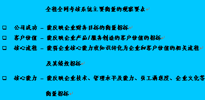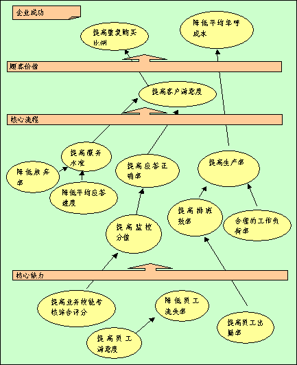 全程全網(wǎng)考核策略目標(biāo)因果關(guān)系圖是"平衡計(jì)分卡"應(yīng)用的重要環(huán)節(jié),在此要特別強(qiáng)調(diào)?因?yàn)樗菍⒏鶕?jù)公司遠(yuǎn)景規(guī)劃以及使命確定的四個(gè)考核維度轉(zhuǎn)化為全程全網(wǎng)考核系統(tǒng)進(jìn)入實(shí)際操作階段之關(guān)鍵步驟。在平衡記分卡的設(shè)計(jì)過(guò)程中,它起著承前啟后的作用,在構(gòu)建呼叫中心全程全網(wǎng)考核系統(tǒng)中全程全網(wǎng)考核策略目標(biāo)因果關(guān)系圖的突破性銜接功能-以其邏輯性的架構(gòu)來(lái)界定和描述實(shí)現(xiàn)全面績(jī)效考核的策略方案。將公司成功、客戶價(jià)值、核心流程和呼叫中心核心能力之間的關(guān)聯(lián)清晰地呈現(xiàn),并將企業(yè)的策略與其績(jī)效衡量系統(tǒng)相銜接。
