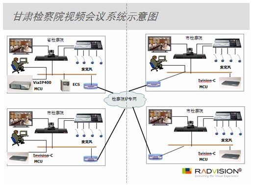 為進(jìn)一步提高檢察系統(tǒng)的工作效率,甘肅省人民檢察院已經(jīng)在其現(xiàn)有網(wǎng)絡(luò)的基礎(chǔ)上建設(shè)覆蓋全省范圍的檢察院專用網(wǎng),并致力于在網(wǎng)絡(luò)內(nèi)建成集領(lǐng)導(dǎo)決策、業(yè)務(wù)處理、信息通訊等為一體的信息管理與服務(wù)的綜合業(yè)務(wù)系統(tǒng)和信息系統(tǒng)資源庫,從而建立起一整套可確保全省人民檢察院工作信息化實施和發(fā)展的機(jī)制,提高全省檢察機(jī)關(guān)的辦公、辦案效率,為檢察機(jī)關(guān)全面履行法律賦予的職能提供技術(shù)保障。RADVISION視頻會議系統(tǒng)正是這個宏大計劃的重要組成部分。