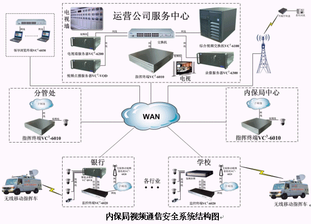 針對以上情況,北京華緯訊電信技術(shù)有限公司基于最新推出的VC3-6000綜合視頻通信平臺(tái)提出了針對性的"城市安保聯(lián)動(dòng)視頻通信平臺(tái)"解決方案。該平臺(tái)整合多種資源,實(shí)現(xiàn)了視頻指揮調(diào)度、遠(yuǎn)程視頻監(jiān)控、視頻會(huì)議、視頻點(diǎn)播、無線移動(dòng)視頻接入、高清晰圖片傳輸和環(huán)境監(jiān)測等功能。平臺(tái)組成如下圖: