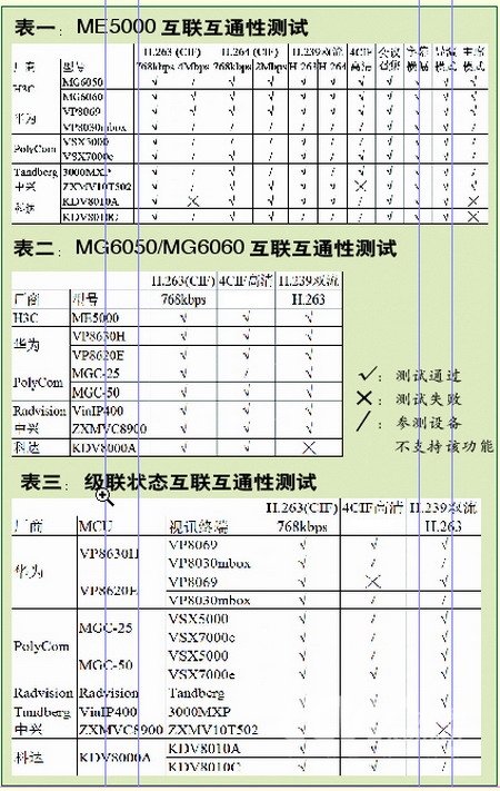 眼見為實(shí),為了驗(yàn)證H3C視訊產(chǎn)品的互聯(lián)互通性,我們對其進(jìn)行了實(shí)際測試;ヂ(lián)互通性屬應(yīng)用級特性,測試起來并不困難,但有些煩瑣。由于視訊系統(tǒng)核心組件通常包括MCU和視訊終端兩類設(shè)備,兼容性互有交叉,因此我們將測試分成3組進(jìn)行。參與測試的設(shè)備除H3C的MCU(多點(diǎn)控制單元)ME5000和視訊終端MG6050/MG6060外,還包括其它5個(gè)廠商的7款MCU和8款視訊終端。