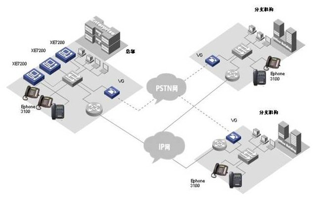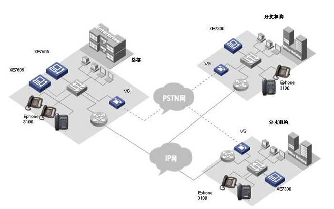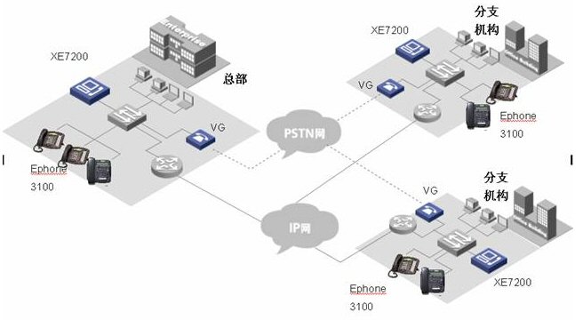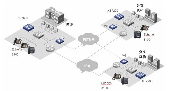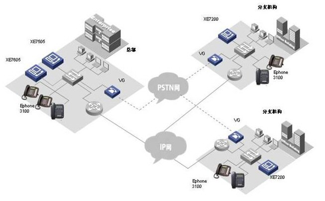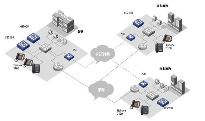 各小分支機構的IP語音終端可以直接注冊到本地XE 7000上, 從而實現(xiàn)整網的分布式部署。