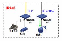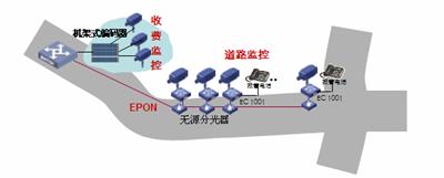 道路沿線監(jiān)控:采用EPON組網(wǎng),路況監(jiān)控球機(jī)接入前端編碼器,多個(gè)編碼器通過一根EPON光纖接入到中心交換機(jī)上,布線方便節(jié)省光纖資源。編碼器內(nèi)置交換機(jī)功能可以接入IP報(bào)警電話方便公路報(bào)警。還可以將支持IP接口的可變信號(hào)板和氣象站直接接入編碼器交換機(jī)端口,實(shí)現(xiàn)一網(wǎng)多用,降低整體網(wǎng)絡(luò)成本。
