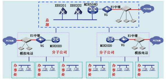 集團(tuán)總部和分子公司部署H3C公司的VG80-20作為語(yǔ)音網(wǎng)關(guān),VG 80-20提供2個(gè)E1語(yǔ)音接口用于接連接程控電話(huà)交換機(jī)PBX的E1中繼線(xiàn),通過(guò)以太網(wǎng)口連接到IP網(wǎng)中。