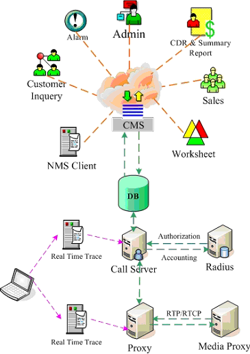 系統(tǒng)管理員通過Web和CMS對(duì)用戶進(jìn)行管理,并通過CS和PROXY所帶的網(wǎng)管功能(NMS)進(jìn)行實(shí)時(shí)的網(wǎng)絡(luò)監(jiān)控及維護(hù),及時(shí)診斷并處理故障。