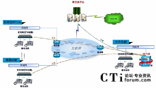 在石家莊,也安裝1臺48FXS語音網(wǎng)關,該網(wǎng)關可接48部模擬話機,通過公網(wǎng)直接注冊至總部的IX-100,作為公司的遠程分機,享受功能和總部的分機完全相同,做到移地仿真的虛擬統(tǒng)一。