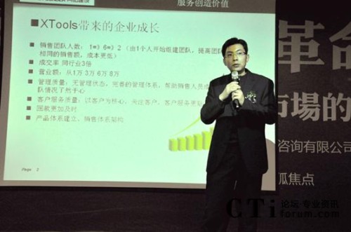 另外,濟(jì)南創(chuàng)弈工場(chǎng)總經(jīng)理趙小峰任曉峰與現(xiàn)場(chǎng)嘉賓分享了自身創(chuàng)業(yè)與成長(zhǎng)過程。創(chuàng)弈工場(chǎng)科技有限公司成立于2008年,是由山東大學(xué)創(chuàng)業(yè)團(tuán)隊(duì)發(fā)展而來的、以先進(jìn)電子商務(wù)架構(gòu)和企業(yè)CI設(shè)計(jì)專家為目標(biāo)的公司。趙總?cè)慰偸且晃?0后互聯(lián)網(wǎng)新銳,他表示:“公司運(yùn)用XTools具有管理思想的系統(tǒng)幫助管理這支年輕的隊(duì)伍,使其健康發(fā)展,對(duì)于創(chuàng)業(yè)者來說,銷售體系的管理是至關(guān)重要的,這樣我們少走了彎路!