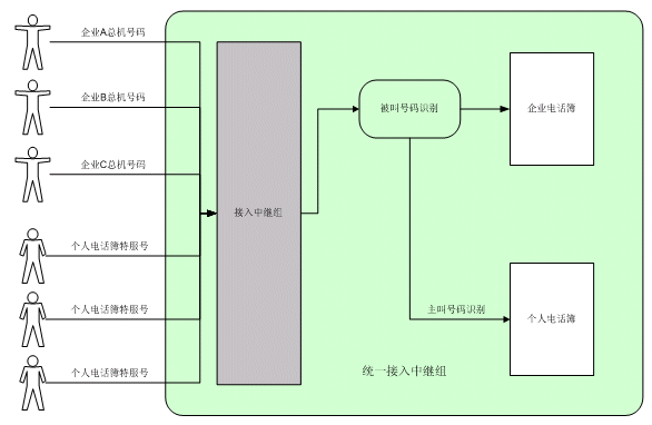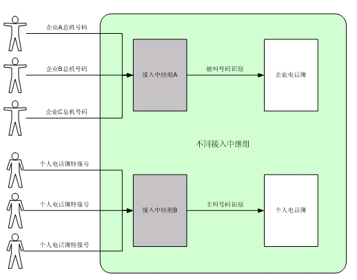 個人電話簿呼叫中,系統(tǒng)將根據主叫號碼,鑒別出主叫的身份,選擇進入相應的個人電話簿,提供個人電話簿服務。
