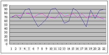 這是兩個呼叫中心從早上8點開始,一直到晚上6點,每隔半個小時的服務(wù)水平。可以很清楚的看到,藍色這條線,它服務(wù)水平在91到48這中間震蕩,平均服務(wù)水平是73左右,粉紅色這條線,雖然平均服務(wù)水平也是在73左右,但震蕩幅度卻小了很多,服務(wù)水平只在81到68這中間震蕩。