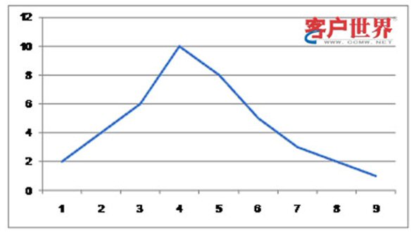 首先我們看到常態(tài)圖對呼叫中心分析的運用。利用最小方差管理法時,經(jīng)常要制作常態(tài)圖來進行分析。常態(tài)圖其實是一張很簡單的圖,例如你統(tǒng)計了你同事每天到公司上班所需的時間:5分鐘之內(nèi)的,有2個;10分鐘的有4個;15分鐘的有6個;20分鐘的有10個;25分鐘的有8個;30分鐘的有5個;35分鐘的有3個;40分鐘的有2個;超過40分鐘的有1個。這時你畫一張常態(tài)圖,就會得到下面的圖(縱坐標代表人數(shù);橫坐標代表所花時間):