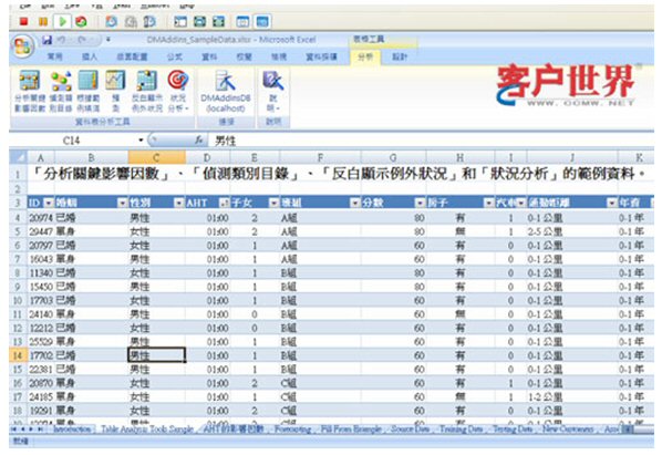 前面談到的Excel功能,都是在Excel 2003可以輕易實現(xiàn)的,但在Excel 2007,有了一個重大的突破,就是提供了一系列的數(shù)據(jù)挖掘工具。微軟把本來屬于非常高深的數(shù)據(jù)挖掘功能,做到了Excel里面,最棒的是,你完全不必懂數(shù)據(jù)挖掘,也不必懂類似MS SQL這種讓人一聽就頭昏的數(shù)據(jù)庫管理。