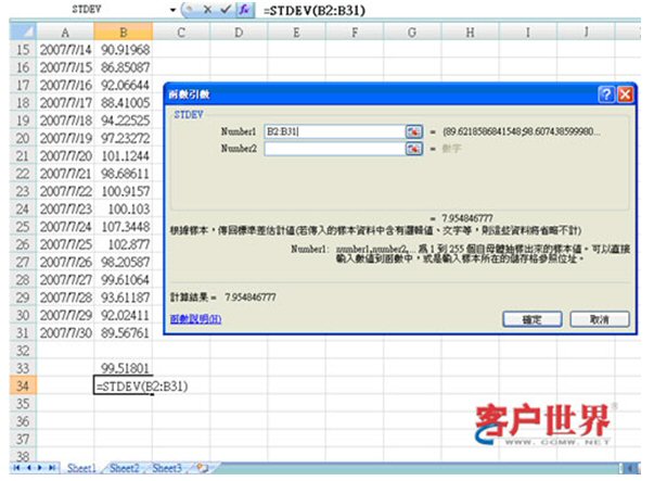 標準差是最小方差管理法高度依賴的指標,計算方法很簡單,在EXCEL里面,只要利用“STDEV”函數(shù),選中你要計算標準差的數(shù)列,如下圖,我們要計算7月1號到30號平均處理時長的標準差,7月1號到30號平均處理時長的數(shù)據(jù),就是B2到B31這數(shù)列,只要選中這數(shù)列,按“確定”,就會得出標準差。