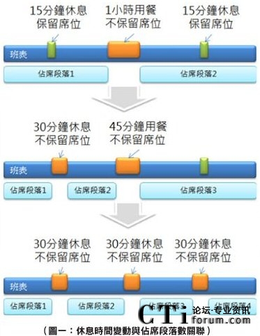 為了紓解話務(wù)尖峰,許多呼叫中心不得不安排痛苦班(或稱為兩段班、天地班),兩個(gè)高峰的間距又不足以再安排一個(gè)正常8小時(shí)的班。在大陸;似乎短班的搭配或采用兼職人員、工讀生的狀況比較少。因此;班務(wù)的設(shè)計(jì)容易導(dǎo)致座位空檔過長,無形中對提升席位利用率也造成了瓶頸。短班的搭配對服務(wù)水平與席位的使用都有顯著的效果,但也相對的造成排班與管理上的困難。但若思考調(diào)整休息時(shí)間,進(jìn)而改變班的占席段落數(shù),則席位利用率可顯著提升。下圖以一正常班為例,在維持班的工時(shí)與總休息時(shí)間不變之下,做休息時(shí)間長度的調(diào)整,可看出占席段落數(shù)的增加。
