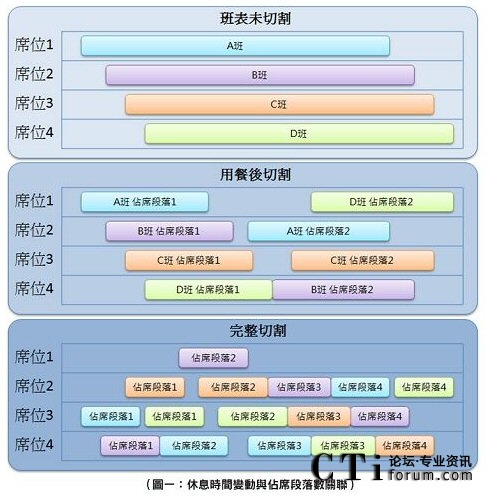 3. 重新思考班別的休息時(shí)間設(shè)計(jì),改變班的占席段落數(shù),并搭配排座系統(tǒng),則席位利用率可顯著提升。