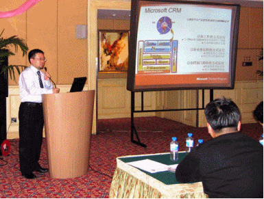 微軟公司負(fù)責(zé)天津地區(qū)的夏玉玲小姐在簡短的開幕式后首先發(fā)表演講,介紹了微軟為商業(yè)應(yīng)用開發(fā)的各種商務(wù)解決方案(MBS)。其后通用咨詢公司總經(jīng)理鄭明先生上臺演說,其演講主題將營銷管理理論體系與微軟CRM密切結(jié)合,博得了與會者贊同的掌聲。
